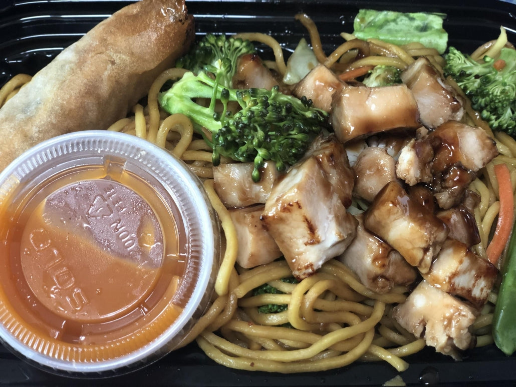 Serve Yakisoba noodles with a scoop of the Teriyaki chicken on top and spring roll on side with Sweet & Tangy dipping sauce.