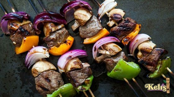 Assemble kabobs on metal skewer alternately threading sirloin, mushrooms, cherry tomatoes, peppers, summer squash and onions.