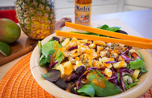 Divide on to 2 plates and top with Sweet & Tangy Dressing