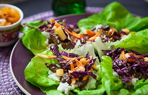 To assemble lettuce wraps; spoon a little rice into each lettuce leaf. Top with a few slices of the Mongolian Beef strips. Garnish with sesame seeds, extra marinade glaze, and a spoon of Asian Pear Slaw. (see recipe)