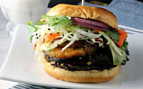 Assembly: Bottom to top. Sriracha-vegan mayo, cabbage, burger patty, pineapple slice, onion, marinated carrots-cucumbers, and top with cilantro (if desired)