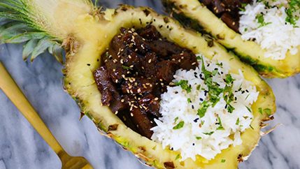 Fill your pineapple boats with rice on one side and chicken strips on the other. Sprinkle with sesame seeds, garnish with cilantro or green onions, serve immediately.